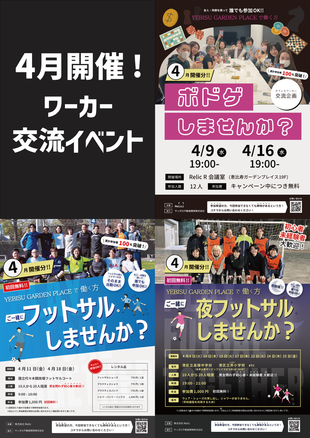 YGPで働くオフィスワーカーの皆様、普段のオフィス生活にちょっとした楽しみを加えるための企画を開催します!オフィスワーカー同士で交流しながら楽しみましょう♪★フットサルイベント★初心者から上級者まで、男女を問わず、すべての人が楽しめるイベントです!体を動かしてから出社したい方や、これまで「やってみたいけど機会がなかった」というビギナーの方も大歓迎です!ぜひご参加ください!◆夜フットサル・開催日:12月15日(月)、12月17日(水)、12月18日(木)、12月22日(月)、12月23日(火)、12月26日(金)・開催時間:開始19:00/終了21:00(予定)・開催場所:港区立高陵中学校、港区立笄小学校、etc(各恵比寿ガーデンプレイスから約20~30分)・定員:10〜20名程度・参加費:1000円(初回無料)・応募締切:開催日前日まで・留意事項:ウェア・シューズの貸し出し、シャワーはありません(学校施設を利用するため)・備考:体育館での開催となるため室内用シューズが必要になります窓口LINE(外部サイト)皆様初めましてからのスタートなので、お気軽にお問い合わせください!皆様からのご応募、お待ちしております!ぜひご参加ください!—---------------------------------------------------------------------------◾️主催:株式会社Relic◾️お問い合わせ先:ygp_event@relic.co.jp—---------------------------------------------------------------------------