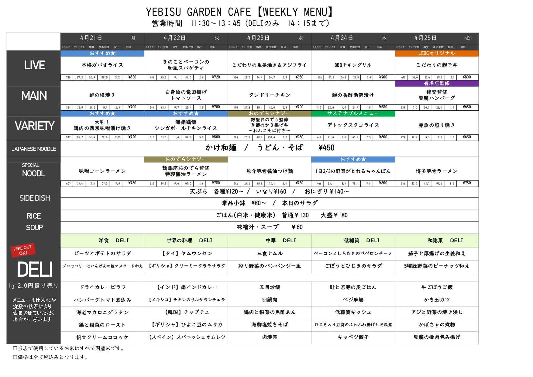 YEBISUGARDENCAFEカフェコーナーでは日替わりで4品のデリセットとカレーを販売開始いたします。