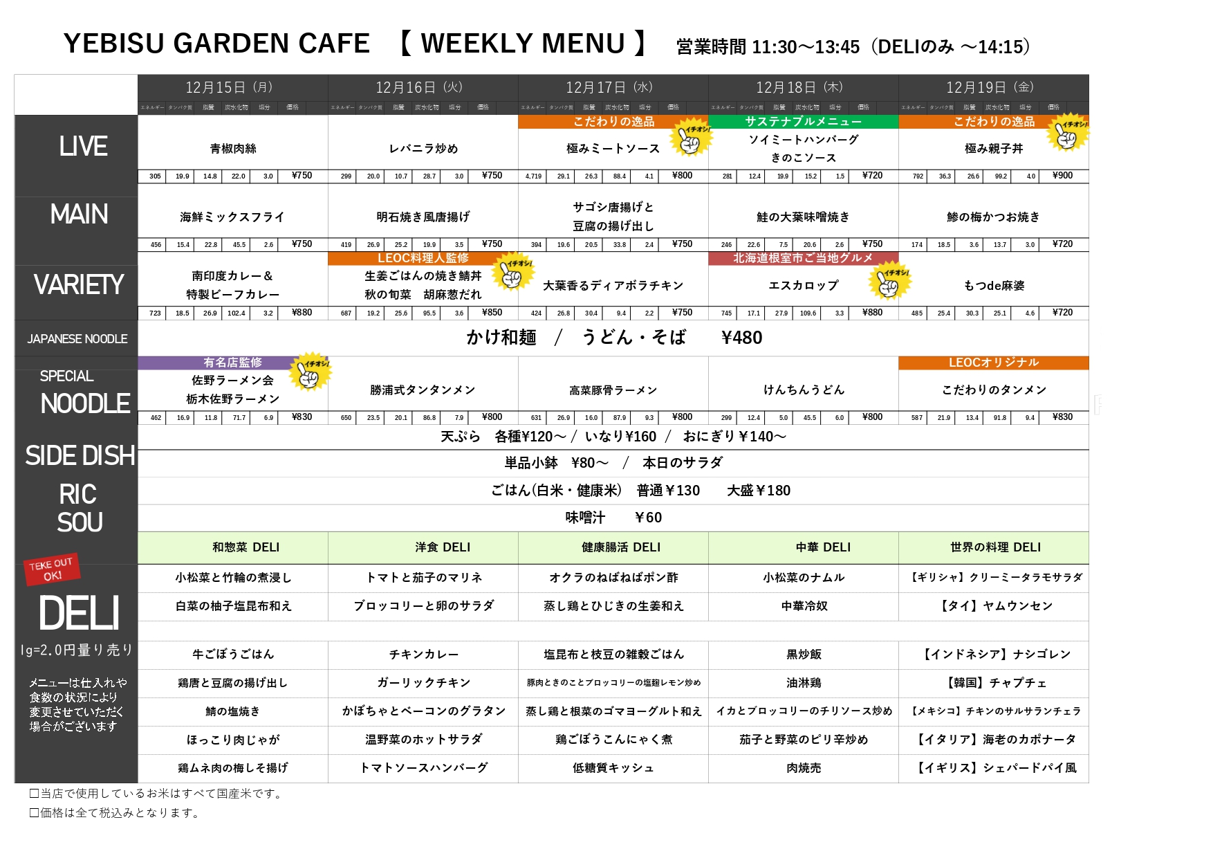 YEBISUGARDENCAFE12/15(月)~12/19(金)のウィークリーメニューカレンダーです。ご来店をお待ちしております。PDFはこちら