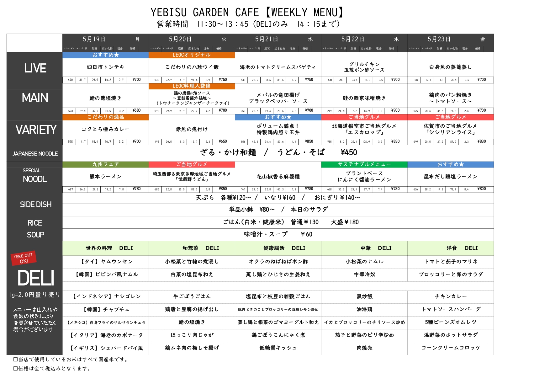 YEBISUGARDENCAFE12/15(月)~12/19(金)のウィークリーメニューカレンダーです。ご来店をお待ちしております。PDFはこちら