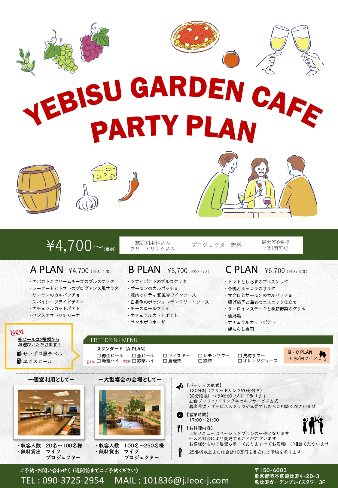 YEBISUGARDENCAFEでは2026年4月よりパーティプランをリニューアルし、ご予約を受け付けております。歓送迎会、懇親会等にぜひご利用ください。PDFはこちら
