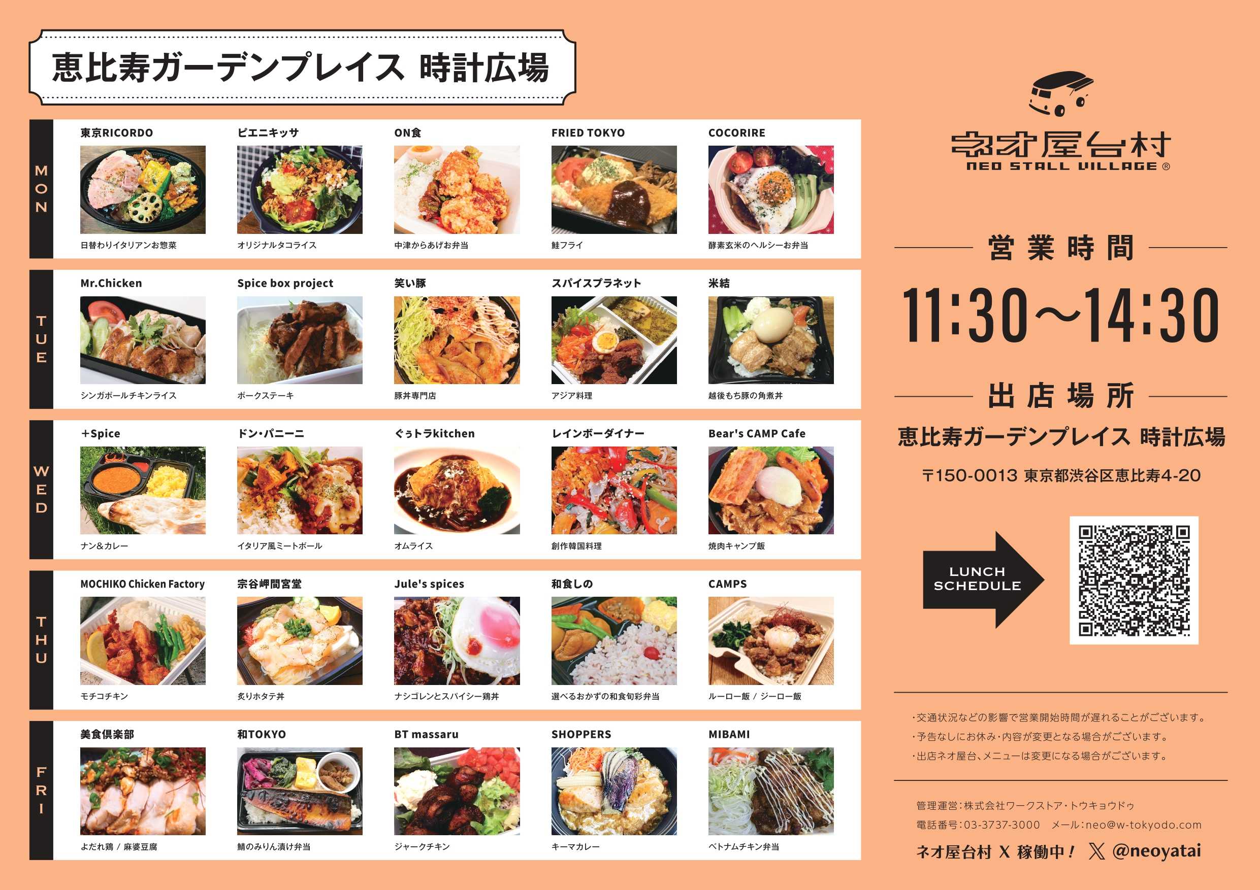 恵比寿ガーデンプレイス時計広場にて、キッチンカーによるランチの販売をいたします。毎週平日、日替わりのキッチンカーが登場します!メニューや出店者は変わる場合がありますので、あらかじめご了承ください。※天候や時間等の影響により、メニューの変更・売り切れ・お休み・開催場所の変更の可能性がございます。予めご了承ください。出店スケジュールはこちら(外部サイト)PDFはこちら
