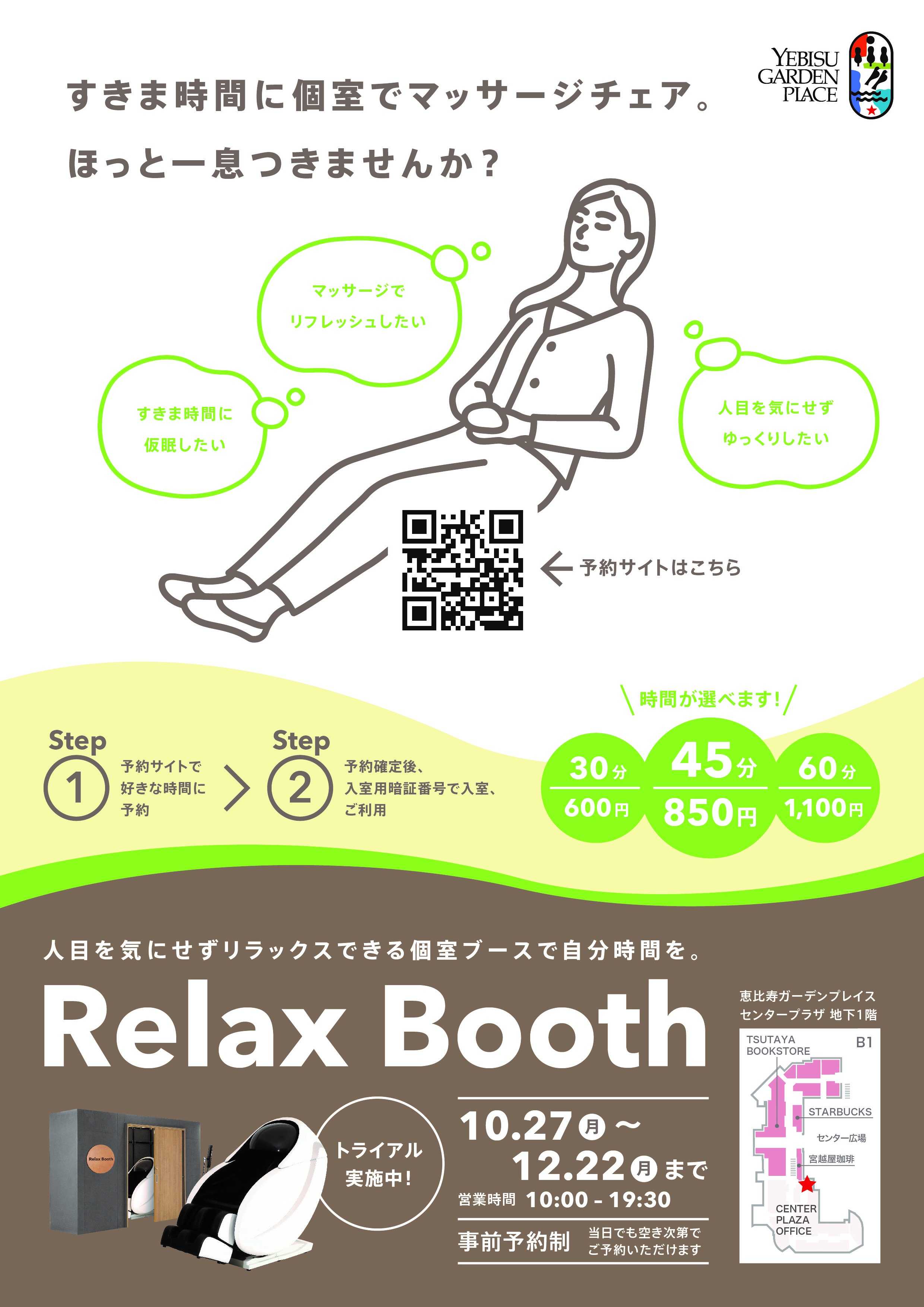 開催期間:10/27(月)~12/22(月)前回ご好評いただいた“RelaxBooth”が、期間限定で再登場。お仕事の合間や移動の途中、仕事終わりに。個室で人目を気にせず、マッサージチェアに身をゆだねる、ちょっと特別なひとときをお過ごしください。「ちょっと休みたい」「気分を切り替えたい」そんな瞬間に、個室のプライベート空間で、心も体もリフレッシュできる“RelaxBooth”は、働く大人のための新しい休憩スタイルです。前回のトライアルでは、顧客満足度・再利用意向度ともに94.7%※と高評価をいただきました。今回も、より快適にご利用いただけるよう環境を整えてお待ちしています。※顧客満足度は「10点満点中7点以上」と回答した割合、再利用意向はそのうち「再度利用したい」と回答した割合を基に算出。●RelaxBoothとは個室ブース内に高性能マッサージチェアを設置し、すきま時間を活用して人目を気にせず気軽に休憩や仮眠ができる、プライベート空間を提供するサービスです。仕事中の眠気や疲労、リフレッシュのための休憩場所としてご利用いただけます。すきま時間に人目を気にしない個室で、頑張る自分を労わる自分時間をお過ごしください。マッサージチェアは1回15分に設定されており、パワーナップ※の利用に最適です。※パワーナップとは、15分程度の仮眠をとることで、その後の業務効率や集中力が向上することが期待される休息方法です。▼▼実施概要▼▼・トライアル期間:10月27日(月)~12月22日(月)・営業時間:10:00~19:30・選べる3コース:30分:600円/45分:850円/60分:1,100円・ご予約・詳細はコチラ(外部サイト)