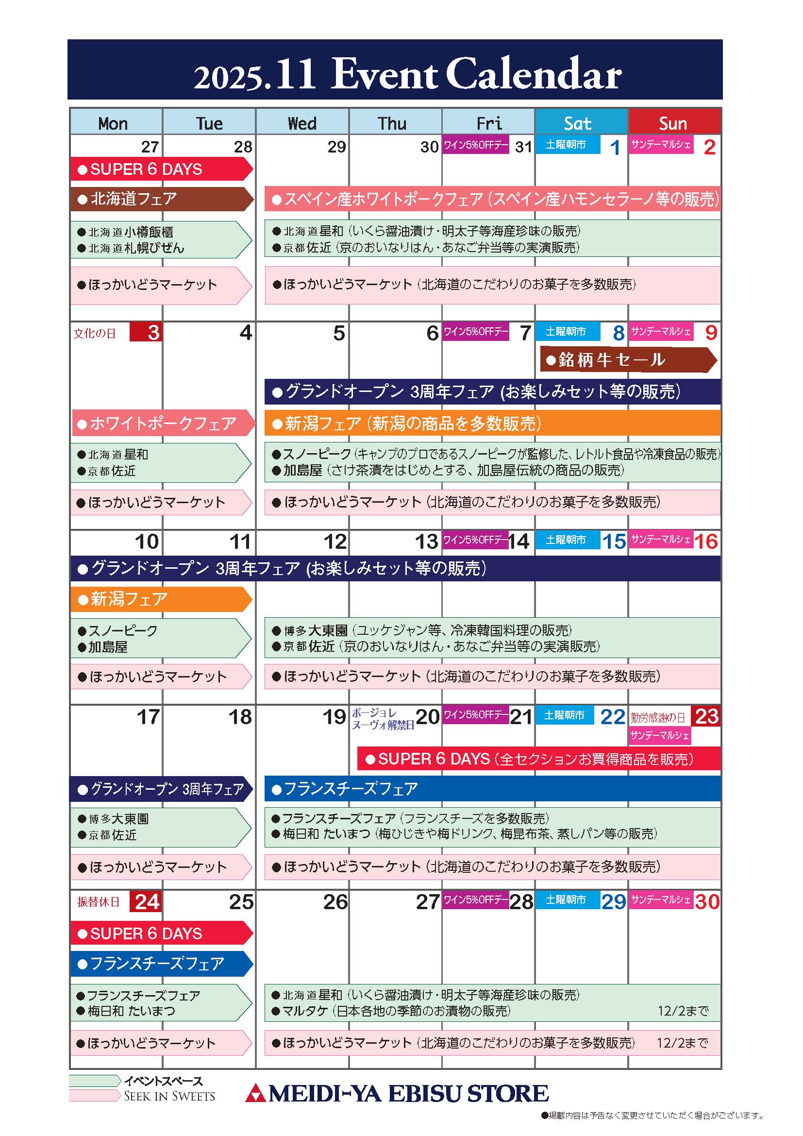 2025.10.30 11月フェア・イベント情報のご案内! 明治屋恵比寿ストアーにて開催予定の、フェア・イベント・お買得日情報をご案内いたします おすすめ商品を多数ご用意して、ご来店をお待ちしております ※フェア・イベント等の内容、および開催が急遽変更・中止となる場合もございますので、ご了承ください。 ※数量に限りがございます。売り切れ次第終了の商品もございますので、あらかじめご了承ください。 明治屋恵比寿ストアー公式HP(外部サイト)