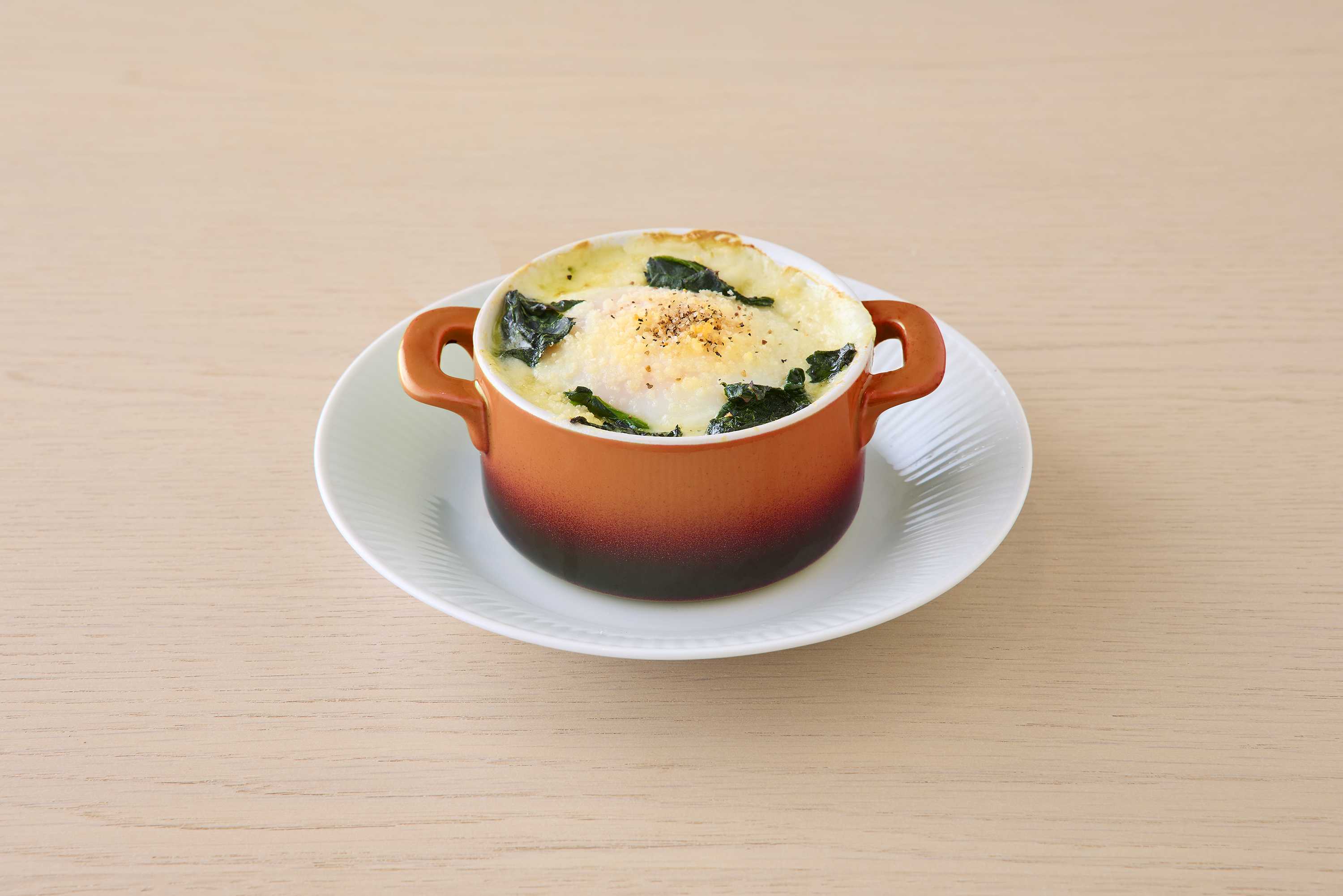 北海道産寒締めちぢみほうれん草と北海道十勝熟成ゴーダに温玉を乗せた定番のグラタンです。