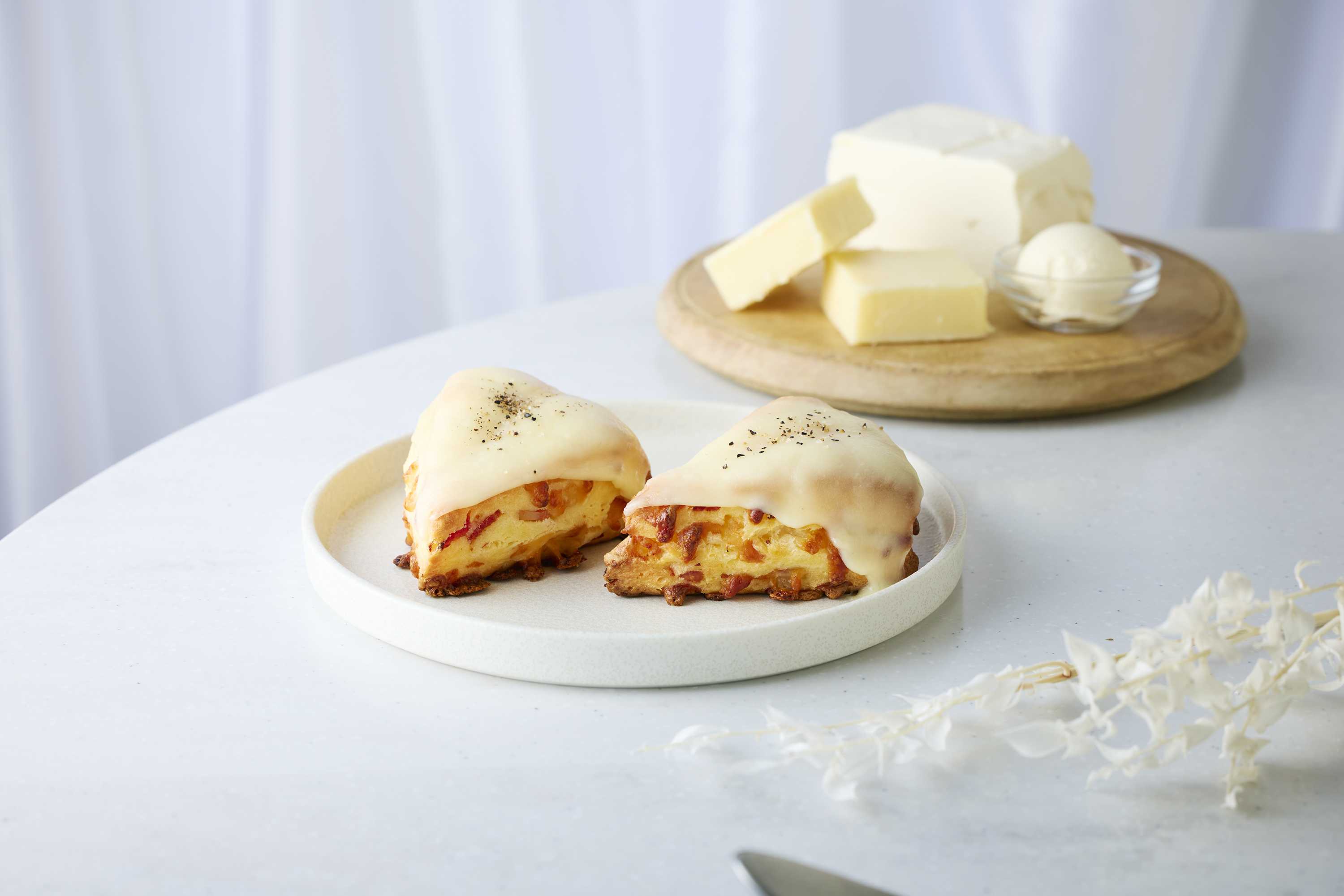 バターミルクパウダーを使用したミルキーな味わいの生地にシュレッドチーズを練り込み、よつ葉北海道十勝とろけるミルクスライスを載せて焼き上げた、チーズたっぷりのスコーンです。