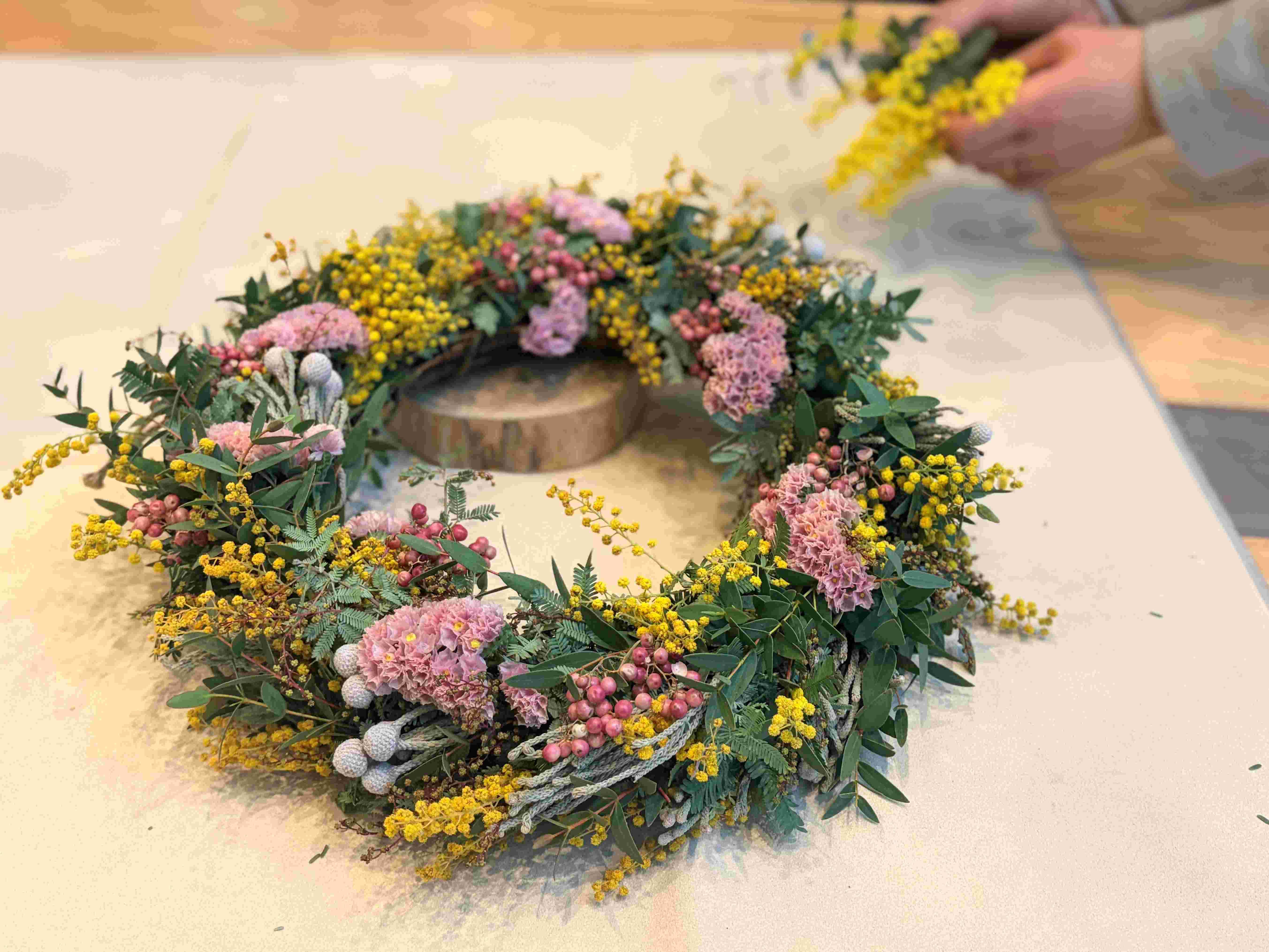 今回は、ミモザをメインにドライフラワーに適したスターチスやピンクペッパーなど春色の花と香りのよいユーカリを使いスプリングガーデンをイメージしたリースを作ります。