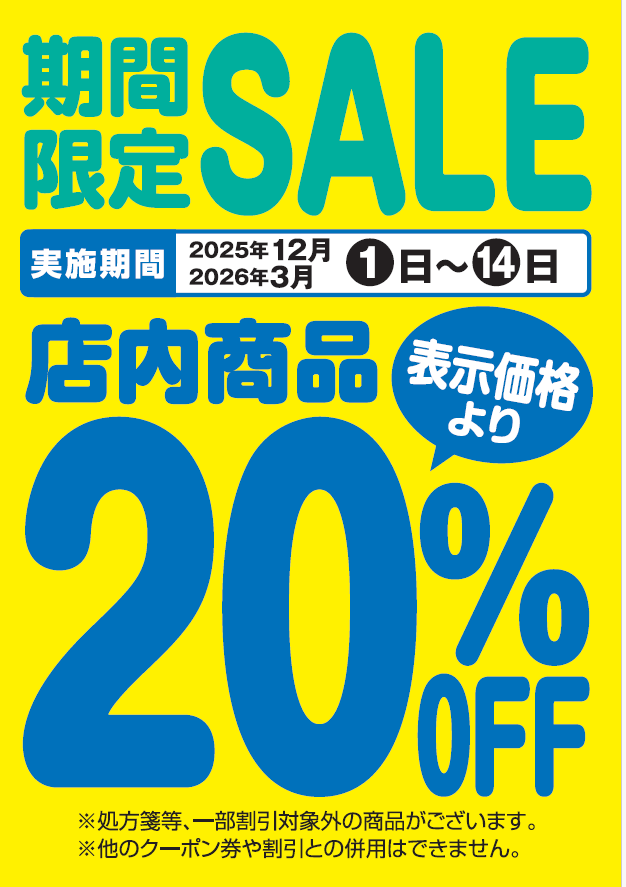 2026.02.26 3月のおすすめと20%オフセールのお知らせ 非常に高品質なイチョウ葉で脳の血流改善により記憶力維持につながります。 軟膏減少によるひざの痛み・腰の痛みに 1回2錠1日3回お飲みください 3/1~3/14まで2週間 店内商品20%オフになります。 処方箋、一部対象外商品がございます。