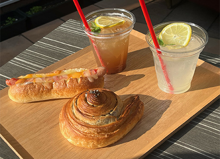 俺のBakery / 俺のイタリアン BeerTerrace〈エントランスパビリオン・時計広場 1F〉トリュフクロワッサン 380円/チェダーチーズホットドッグ 380円/レモンスカッシュ 500 円/クラフトコーラ 580円 -